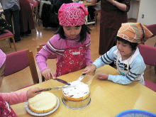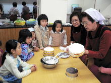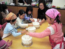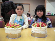 | 平成18年12月16日、北総合校生活学習室において市民スクール21を開催しました。今回は「親子クッキング教室でクリスマスケーキ作りを楽しみました。幼稚園から小学生の児童11名が参加しました。いきいきサロンとの共催でお年よりはクリスマスツリーの壁掛けを作りました。お年寄りと子供の交流もうまくできて大変楽しく有意義な企画となりました。 | ||