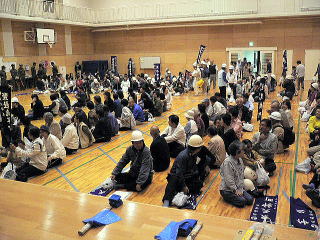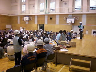| 4班に分かれて訓練の後、体育館での避難所体験 | |