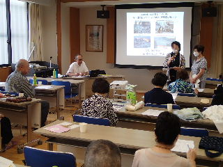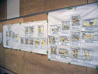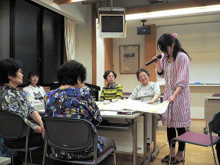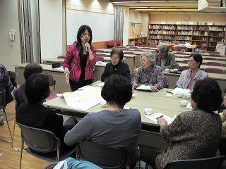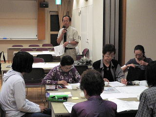 | 平成21年9月10日、北総合校生活学習室において市民スクール21を開催しました。今回は住協の様々な行事やまちづくり推進委員会で協力して頂いている立命館大学の石本ゼミの石本幸良先生をお招きして、21年3月に完成した大災害時の避難所マニュアルについて、女性会の皆様とワークショップ形式で意見交換、ご講演頂きました。ゼミの学生諸君もワークショップのリーダーとして参加、協力してくれました。大災害時の避難所で起こりうる諸問題について意見を出し合いました。参加者30名。写真左上が石本先生。他の写真は女性会の皆さんをワークショップのリーダーとなって熱弁をふるいながらひっぱるゼミの学生諸君です。 | |