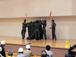 | 315名が町単位で整然と体育館に避難完了! | 物干し竿や毛布を利用して応急の担架作り |