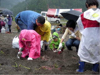 | 10月26日、毎年恒例のいもほり大会を開催しました。当日は早朝から小雨が降り続いていましたが、天気は回復に向かっていると判断して決行することにしました。雨降りにもかかわらず申込者は全員参加してくれました。往路のバスの中は元気な子供たちでにぎやかです。30分ほどでバスは畑に着きました。雨の中で少補の役員さんはテキパキと働いていました。 さっそく全員で「いもほり」をしました。どんな大物が出てくるか一番楽しい時です。あちこちで大きい物も有りましたが、昨年に比べて全体に小振りのように思いました。昼ごろには雨も上がると思っていましたが、無情な雨は降り続きます。昼食の牛丼を食べた後自由時間でしたがテントの下で雨宿りするしかなくて、予定を早めてバスに迎えに来てもらって早々に帰路につきました。天候がとても残念でした。参加者86名。 |