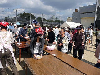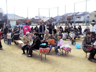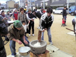 | 平成23年12月4日、毎年恒例の餅つき大会を開催しました。好天に恵まれて多数の地域の方々にご参加頂きました。北総合校PTA、烏丸中PTA等の協力を得ておぜんざいやおろし餅、草餅等を楽しみました。近年は家庭で餅つきをするところがほとんどなくなり貴重な体験だと思います。地域で取り組んでいるゴミの減量化・資源の節約を目的に今年も「食器の持参」をお願いしました。 これからも地域のコミュニティーの場として、ますます多くの方々にご参加いただける行事にしていきたいと思っています |