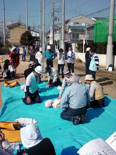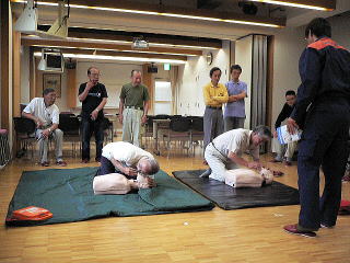 | 平成21年7月12日、消防署や消防分団の協力の下、普通救急救命講習会を開催しました。人が急に倒れたとき、救急車が来るまでの数分間の対処の仕方で救命率は大きく変わります。地域に救急救命の知識を多数の方が持っておられるということは、地域全体の安心につながると思います。写真は心肺蘇生法やAEDの取扱について熱心に講習を受ける参加者です。町内防災部長を中心に21名の参加者でした。 | |