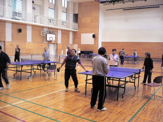 | 卓球大会 平成24年2月26日、北総合校体育館におきまして成逸卓球大会を行いました。上級の部とピンポンの部に分かれてダブルス戦で楽しみました。上級の部優勝は川田会長(竪社北半町)と笹田(聚楽)、準優勝は丸山(聚楽)と俵(聚楽)、ピンポンの部優勝は極並(北仲之町)と斉藤(室町)、準優勝は大坪(北筋違橋町)と横田(下天神町)の各ペアーでした。いつも成逸のナイタースポーツの卓球の練習に来られている近隣学区の方々にも参加して頂き交流を兼ねて親睦を深められたと思います。参加者30名。4〜5年前より上級クラスとピンポンクラスに分けて競技をするようになってから、参加者がだんだんと多くなってきて喜んでいます。 |
