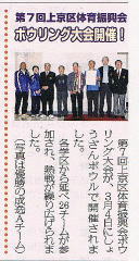 | 平成24年3月4日、しょうざんボウルにおいて第7回上京区民ボウリング大会が開催されました。上京区の各学区代表の精鋭26チームの参加のもと団体戦と個人戦が行われ、成逸学区も2チームがエントリーしました。 成逸学区は毎年好成績を収めており、今回も団体戦では成逸A(山田、平野、上西)が優勝と大健闘しました。成逸は第2、5回大会でも優勝しており今回が3回目の優勝で、3人×3ゲームの9ゲームトータルで1,854点の高得点でした。1,854点は過去最高得点です。成逸B(大坪、大石、川田)はイマイチ調子が悪く13位の成績でした。個人戦では上西氏が3ゲームで635点で2位に、山田氏が615点で5位に入賞しました。 写真右は4月15日号の市民新聞上京区版です。 |