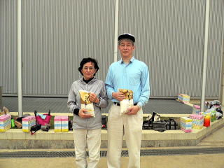 | 優勝商品のお米をもらってにっこりの優勝ペアー | 参加者の集合写真 |