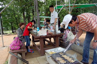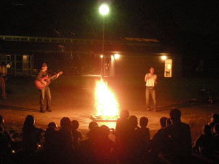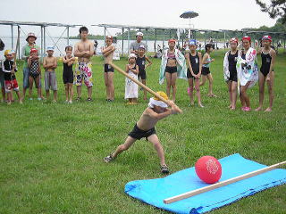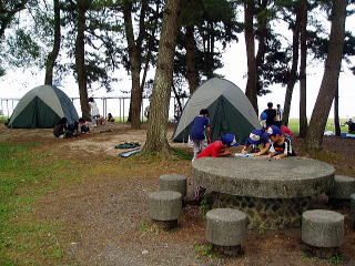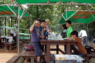 | 平成22年7月31〜8月1日、4支部合同行事サマーキャンプを「びわ湖こどもの国」において開催しました。参加者104名。 7月31日 天候晴れ お昼ごろにびわ湖こどもの国に着きました。手持ちのお弁当を食べて、午後からは水泳をしました。 ここは、地形の関係で、泥が底に溜まりやすくて、人が多く入ると水が濁ってしまいます。それでも、子供たちは一生懸命に泳いでいました。水泳の合間に風船割りをしました。西瓜わりの代わりです。(生ごみを出さない為)やっぱりほんまもんの西瓜を割る方が気持ちが入るように思います。 夕食は皆でカレーライスを作りました。飯盒でご飯も上手に炊けました。夜はキャンプに詳しい助っ人の影丸さんとダンプさんのリードでキャンプファイヤーを囲んで、歌ったり、ゲームをしたりと楽しい時間を過ごしました。 8月1日 天候晴れ 午前中は、ウォークラリーをしました。こどもの国の王様が悪者にさらわれて,その王様を助け出すと云うシナリオで、楽しいウォークラリーで子供たちも随分楽しかったようです。 午後からは自由時間として、思う存分にびわ湖こどもの国の遊具で遊んでもらいました。全体を通して、子供たちも大満足でした。 夏休みの楽しい思い出となったと思います。 |