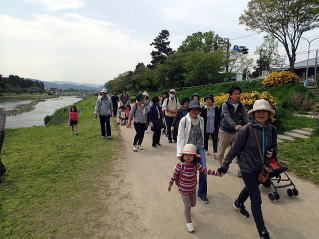 | 歩こう会 平成29年4月29日、今年度成逸体振1回目の行事、歩こう会を開催しました。参加者35名で北総合校から賀茂川の西べりの遊歩道を通り、子供の楽園、宝ヶ池へと歩きました。 当日はうす曇の心地良い気温で、すがしい気分で歩くことができました。木々の新緑も深く幼児から高齢の方までさわやかな空気と素晴らしい景色を堪能しました。 |