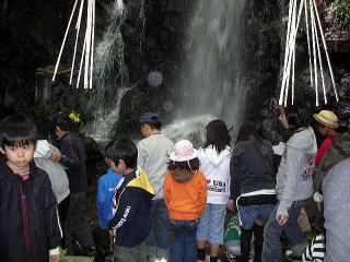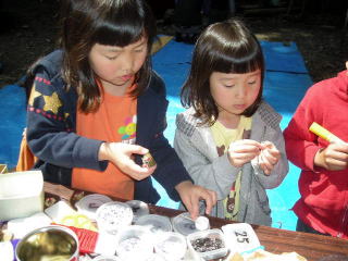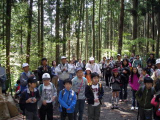 | 平成22年4月29日(祝)、天気 雨のち晴れ 参加者53名。 未明から降った強い雨も上がって、木立の中を歩くハイキングも清々しい空気に満ちていました。今年は清滝から空也の滝まで足を延ばしました。滝は雨の降った後で、水量もあって迫力を増していました。子供たちも「ワアー。」とか「ウオー。」とか言って、感嘆していました。ここは八大竜王をお祀りした霊場で、しばし荘厳な雰囲気に浸ることができました。 飯盒炊飯の後は木片や木の実、植物の種などを使ったクラフトでバッジやペンダントを作りました。子供たちだけでなく、大人もハマってしまい一生懸命になってしまいました。充実した内容の行事になりました。 |