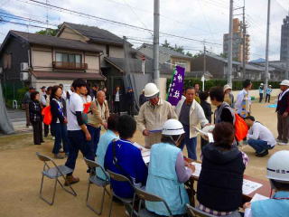 | 今回初めて避難者名簿を作成しました。立命館大学の石本ゼミの学生の協力で 名簿をパソコンに取り込みデータ化する練習もしました。名簿の作成に大変時間がかかることがわかりました。 その後、牧本自主防会長の訓練開始の挨拶 |