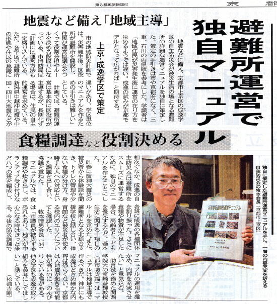 | 成逸の避難所運営マニュアル策定が京都新聞に掲載される! 平成21年4月12日の京都新聞朝刊社会面で、「自主防災会」及び「まちづくり推進委員会」が策定した大災害時の避難所運営マニュアルが大きく取り上げられました。 大災害時の避難所の運営は基本的には区役所が主導しますが、長期化する場合は住民の自主的な運営が求められます。まちづくり委員会ニュース5号で内容の抜粋を掲載していますが、マニュアルは避難所のスムーズな運営に不可欠と考え、関西学院大で都市防災を研究されている室崎益輝先生や立命館大学で地域ボランティアにいて研究されている石本幸良先生の助言、ご指導を頂き、また、上京区役所や消防署、北総合校にも相談しながら策定しました。今後も研究を重ね内容を充実したく思っています。 避難所運営マニュアル抜粋(PDFファイルを開く) |