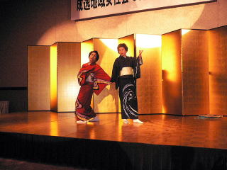 | 艶やかな着物姿の役員さんと輪になって踊りを楽しむ参加者 | |