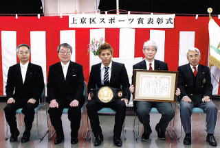 | 3月10日に行われました上京区スポーツ賞表彰式 左より南上京区副区長、豊田上京区長、船橋俊一氏、 川田成逸体振会長、廣瀬上京体振連合会長 |