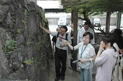 石垣に刻まされた家紋など成逸学区の歴史文化に触れるマンション住民ら(京都市上京区)。 |